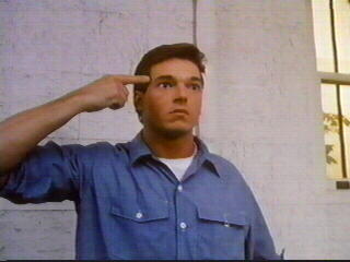 We are now at a transition between the tale of young and old Billy. Since there is a stoppage in recycled footage, we get to watch in awe of Eric Freeman’s (Ricky, in case you forgot) acting ability. He simply has no control over his emotional range. Any call for a slight raise in emotions means he simply blows his top and chews his lines and scenes up like a maniac. His eyebrows rise and fall like the chart of the heart beat of a man going into a cardiac arrest. His energetic approach to acting is made even more ridiculous by his size. In any given scene, he is simply a giant man yelling and bounding about, as his eyebrows display thousands of random emotions at once.