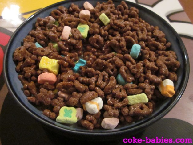 General Mills’ web site claims that Chocolate Lucky Charms was introduced in 2005. They have no reason to not tell the truth, but I am still going to go ahead and wildly accuse them of lying. This accusation is based solely on the assumption that if Chocolate Lucky Charms existed for that long, I would have heard of it. My cereal modesty knows no bounds.