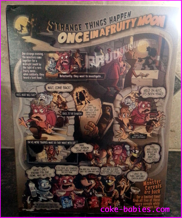The boxes’ backs show how the main three monsters meet Fruite Brute and Yummy Mummy. It seems strange to me that monsters would be so scared of hearing a wolf’s howl, especially since they have the advantage in numbers, but once they all hang out and have cereal, everything is cool. Just like in real life. Except it seems there’s only enough milk for one bowl, which Boo intends on stealing. I told you Boo sucks.