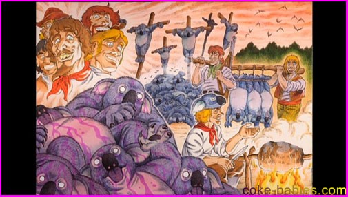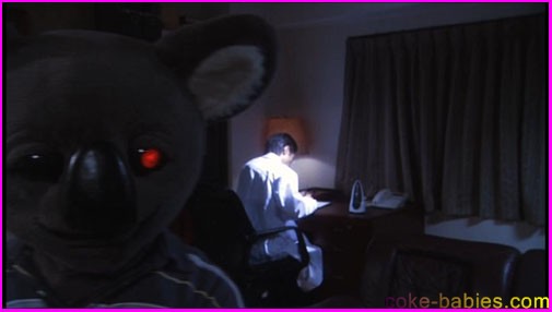The children (and the credits) name the masks as Dabby Duck, Mac the Mouse, Pussy Cat, and Father Christmas. Looking more into the movie, I wondered if these were Australian cartoon characters, or just ripoffs of the name Daffy Duck and Mickey Mouse. I didn’t find anything regarding the characters, so I assume they’re just for the movie.
